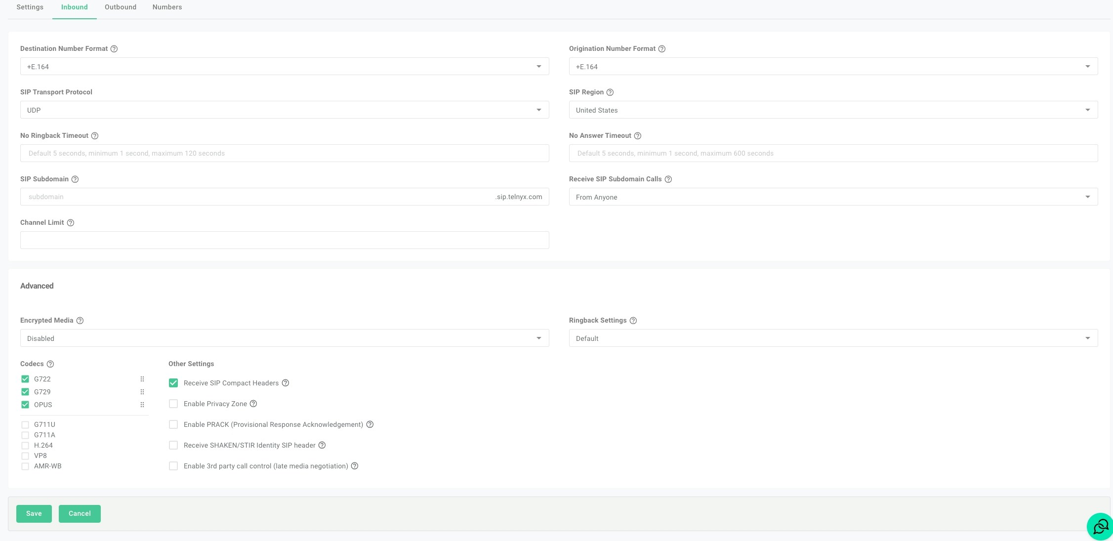 TCPas the transport method. (UDP temporarily not supported due to a connectivity issue) - Select your SIP region.
