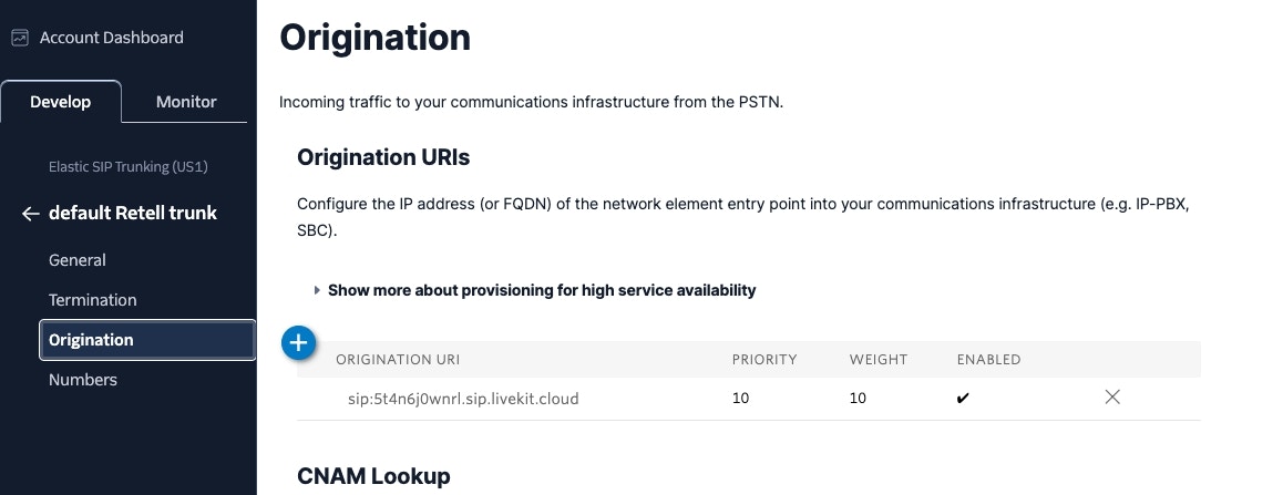 - Here you will specify PreCallAI’s SIP server address as the origination SIP URI: